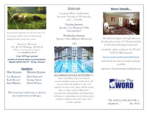 « All Events This event has passed. Feeding the Flock 2025 YOUTube Live stream: bit.ly/KTW_Events March 17, 2025 @ 3:00 pm - March 20, 2025 @ 3:00 pm « Workers Together (Shepherding Conference) Thursday Afternoon Bible Study at Crestwood Manor » Live stream YOUTube address: bit.ly/KTW_Events Add to calendar Google Calendar iCalendar Outlook 365 Outlook Live Details Start: March 17, 2025 @ 3:00 pm End: March 20, 2025 @ 3:00 pm Event Category: Conferences Venue America’s Keswick 601 Rt 530 Whiting, NJ 08759 United States + Google Map View Venue Website